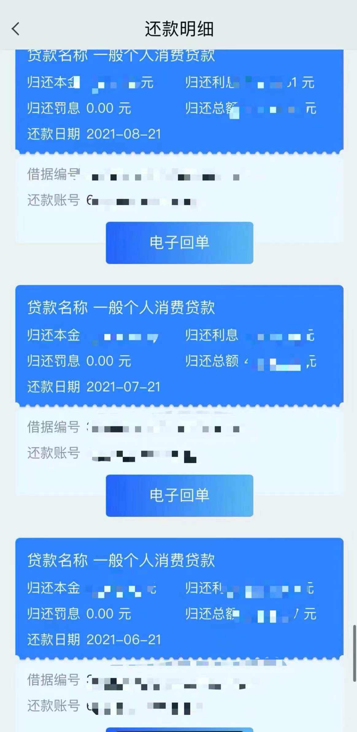 更蹊跷的是,这些贷款的借款人都没有从银行拿到贷款合同。借款人可以从手机APP上进行还款,上面显示的信息明确列有“一般个人消费贷”字样,每次还款回执也显示为消费贷还款,在“是否首套房贷款”栏目显示为“否”。