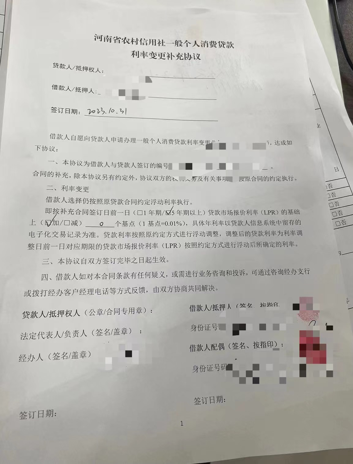 (个人消费贷款利率变更补充协议。)