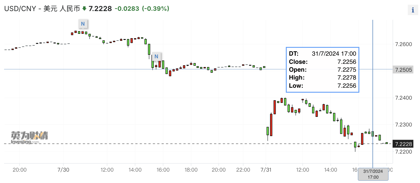 早在7月25日,人民币就在日元带动下大幅升值。当日离岸人民币对美元从7.2719一路下行,最低至7.2035,一度涨超600点。