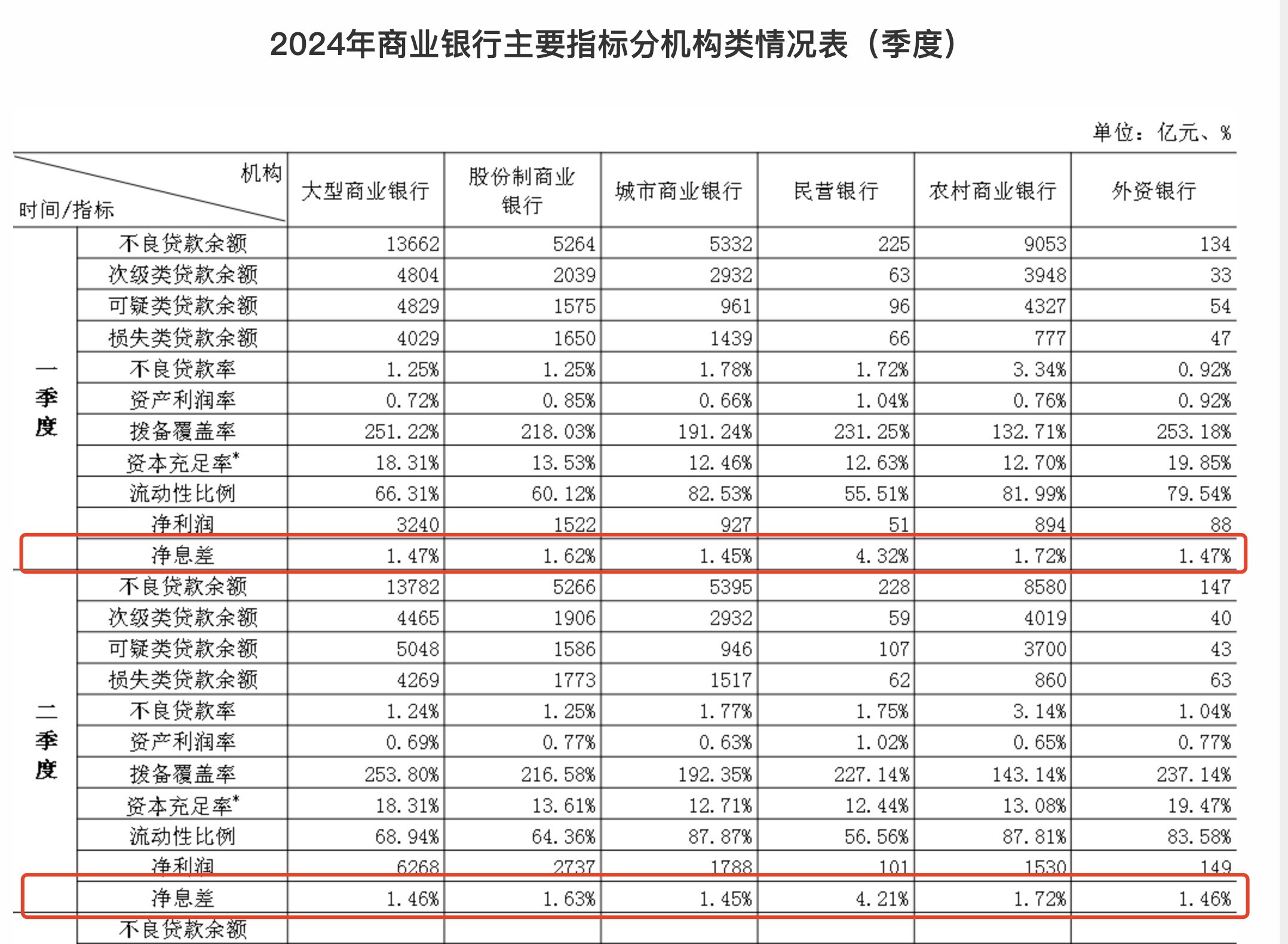从具体机构类型来看,股份制商业银行二季度净息差较一季度上升0.01个百分点,为1.63%;城市商业银行和农村商业银行二季度净息差与一季度保持一致,分别为1.45%、1.72%;大型商业银行、民营银行、外资银行二季度净息差较一季度进一步收窄,分别为1.46%、4.21%、1.46%。