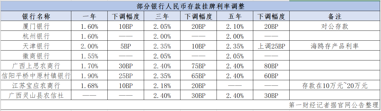 据第一财经记者不完全统计,自六大国有行、12家股份行下调存款利率后,徽商银行、天津银行等十余家中小银行陆续下调挂牌存款利率,下调幅度从10BP~80BP不等,调降后利率全线低于2.5%。