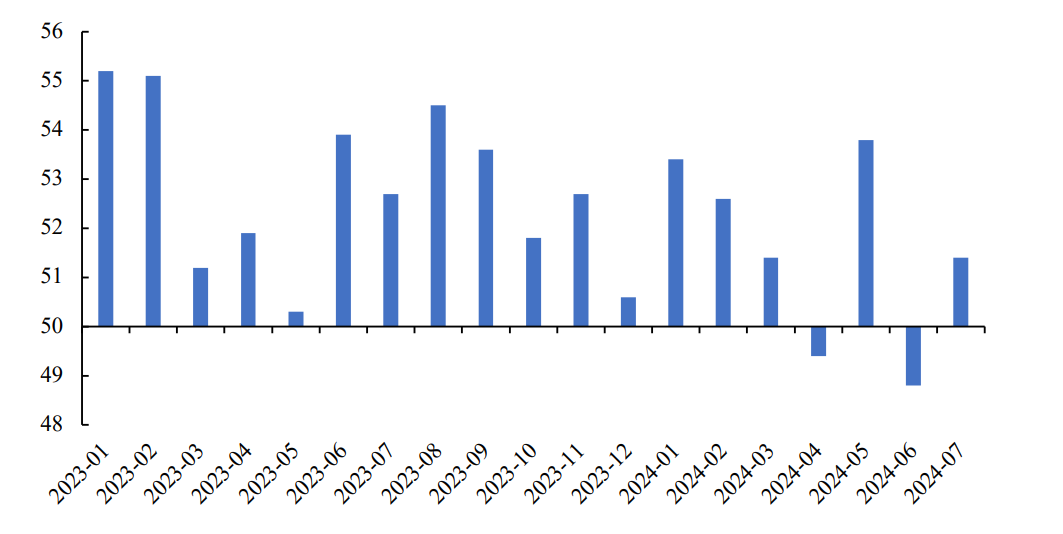 从8月5日大跌到8月6日反弹,全球股市经历了一次“过山车”行情。虽然股市波动的原因有很多,但本次全球股市巨震由美国经济数据主导。8月5日之前公布的美国就业数据和制造业PMI数据不及预期,导致市场对美国经济衰退风险定价迅速上升。8月5日之后公布的两项重要经济数据大大减缓了市场对美国经济衰退的担忧:一是美国非制造业PMI在7月上升至51.4,高于前值48.8和预期51(见图2);二是美国劳工部公布上周(8月3日当周)美国首次申请失业金人数为23.3万人,低于前值24.9万人和预期的24万人。