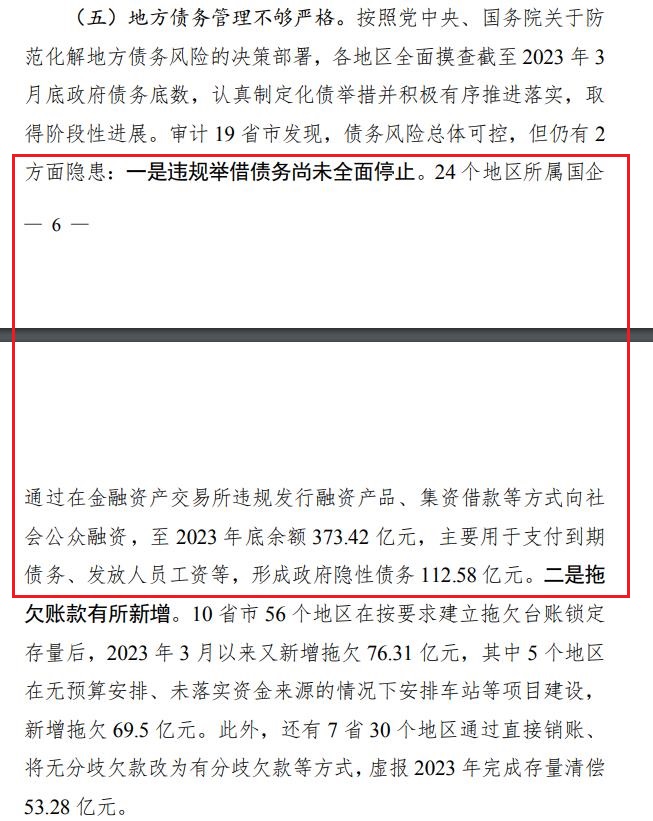 今年6月25日审计署的报告显示:24个地区所属国企通过在金融资产交易所违规发行融资产品、集资借款等方式向社会公众融资,至2023年底余额373.42亿元,主要用于支付到期债务、发放人员工资等,形成政府隐性债务112.58亿元。