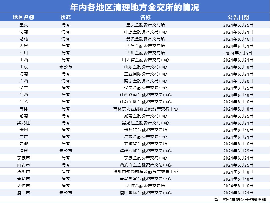 据第一财经不完全统计,年内,合计25家地方金交所被取消业务资质,19个省份明确实现金融资产类交易场所清零。目前还有个别金交所仍在清理存量业务,诸如北京金融资产交易所等。
