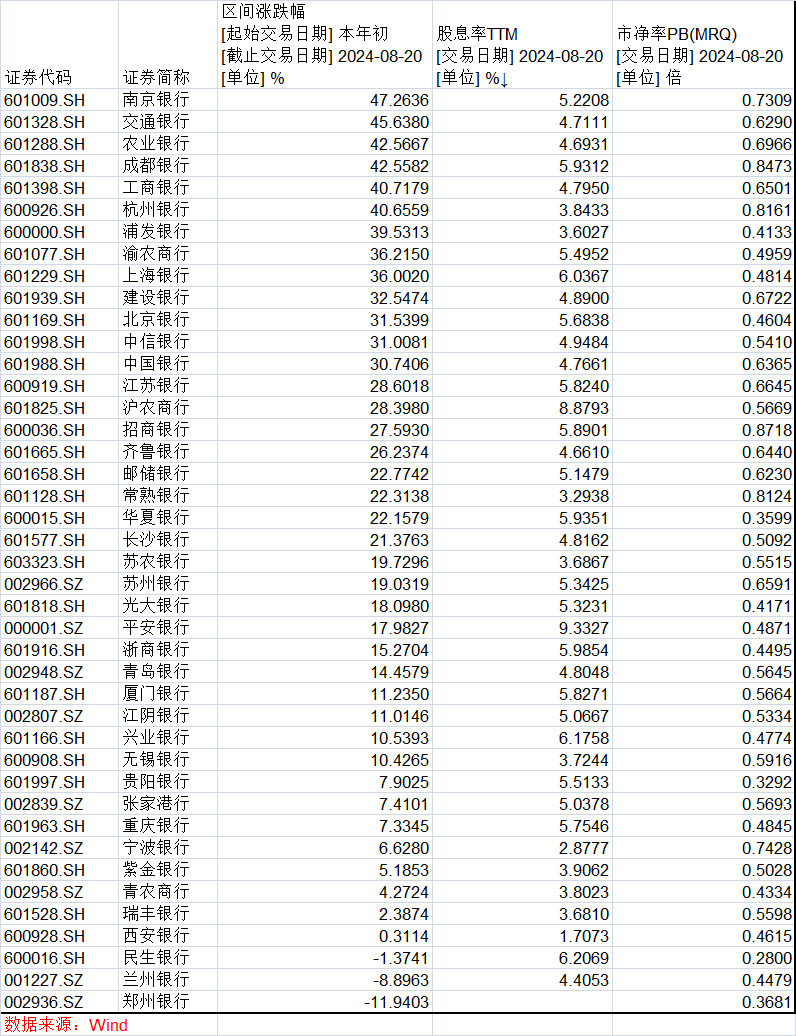 业内人士分析认为,银行股本身低估值但高股息,具备配置价值,多路资金增持尤其是ETF资金涌入成为银行股被买爆的基本逻辑,叠加近期多家上市银行陆续披露“期中考”成绩单,净息差出现小幅企稳趋势,推动银行股持续上涨。
