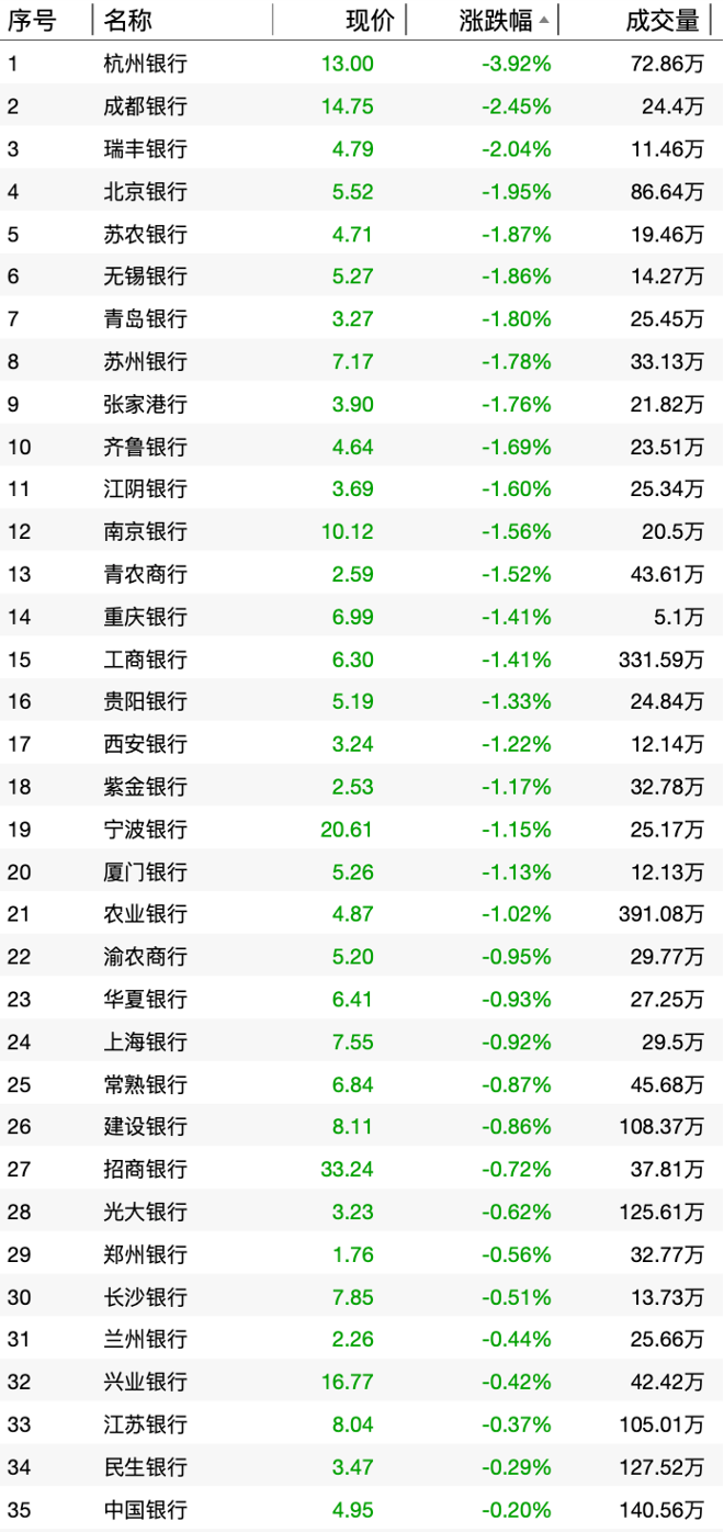 下跌个股中,杭州银行收跌3.92%领跌,股价报13元,盘中一度跌近5%。成都银行、瑞丰银行收盘也跌超2%,跌幅居前的个股大部分为城农商行,国有行跌幅最大的是工商银行,收盘跌1.41%,股份行在这轮下跌中跌幅较浅,招商银行跌幅最大,为0.72%。