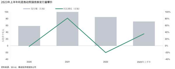 “境外发债依然低迷,由于较高的境外利率令首次发行人望而却步,上半年境外企业债券发行量同比下降约40%至260亿美元。”穆迪副董事总经理钟汶权对记者表示,中美两国间的利差推动2023年上半年熊猫债券发行量创历史新高。2023年上半年,外国发行人在中国境内市场发行的人民币计价的熊猫债券发行量攀升至人民币720亿元, 相当于2022年全年发行量的85%。主要推动因素是随着中美两国利差扩大,人民币计价债券相对于美元债券的融资成本较低。鉴于利差依然存在,穆迪预计该趋势将会持续。