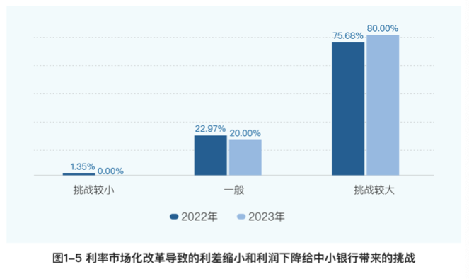 《报告》显示,针对“利率市场化改革给中小银行利润带来的挑战”问题,80%的受访银行表示“挑战较大”,这一比例较去年上升4.32%,反映出中小银行对利差缩小和利润下降的普遍担忧。