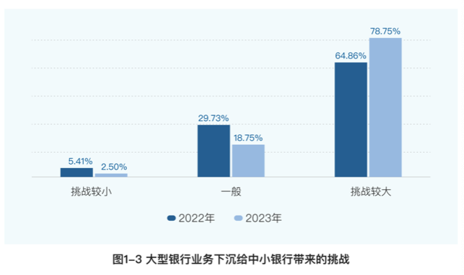上述《报告》显示:针对“大型银行业务下沉给中小银行带来的挑战”问题,78.75%的受访银行表示“挑战较大”,较去年增加了13.89个百分点。