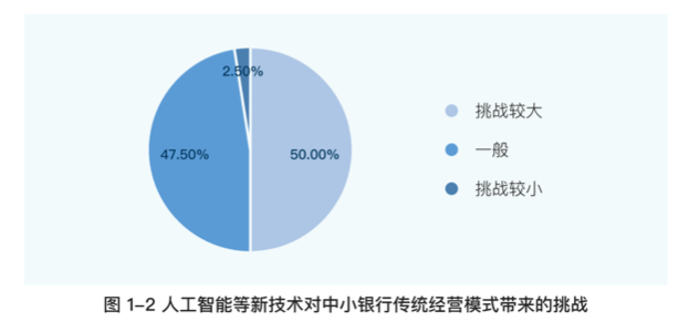 根据11月29日中小银行联盟、金融壹账通及金融科技50人论坛联合发布的《中小银行金融科技发展研究报告》(下称《报告》)显示:针对“人工智能等新技术对传统经营模式带来的冲击和挑战”问题,50%的受访中小银行选择了“挑战较大”,47.5%选择了“挑战一般”,仅有2.5%选择“挑战较小”。普遍承压背后,与中小银行自身应对技术冲击的客观能力不足高度相关。