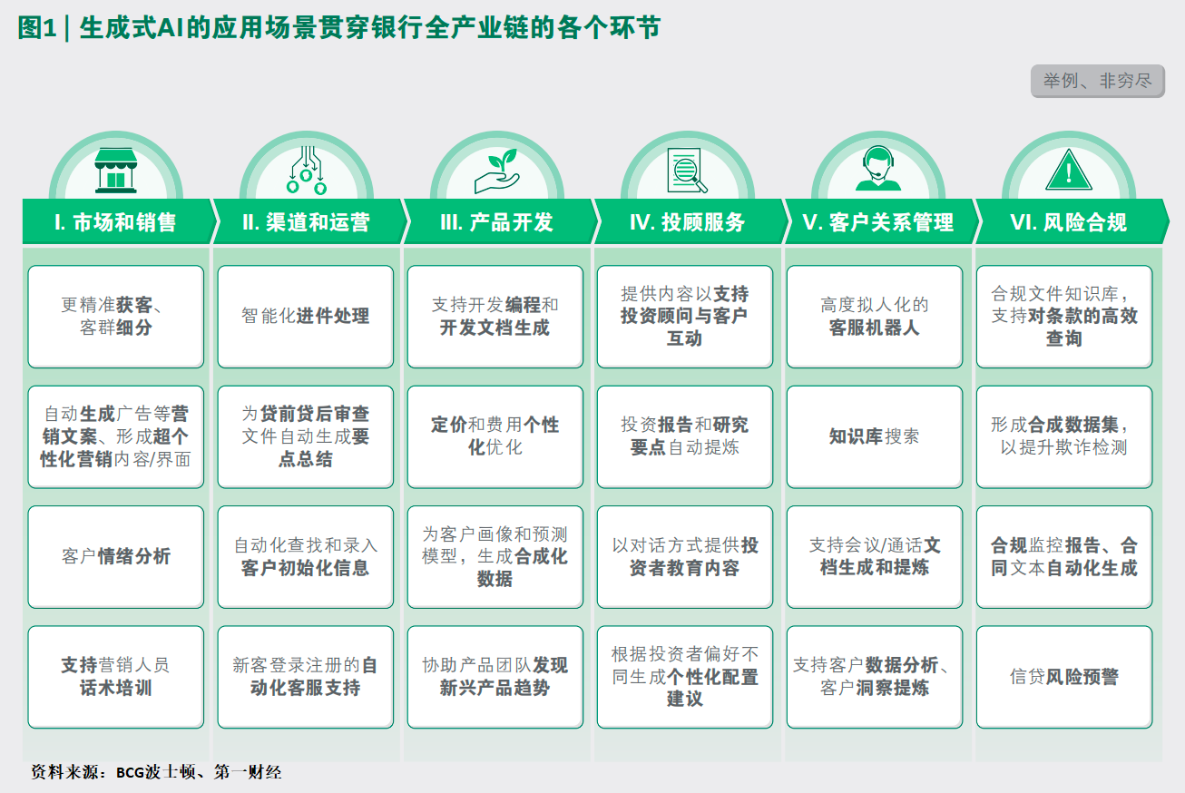 2023年以来,ChatGPT引爆各行各业对生成式AI(AIGC)的应用探索。在帮助金融机构提升客户服务响应能力、为用户提供个性化理财建议、增强市场洞察能力强化市场营销、增强风控能力等方面,生成式AI技术有很大的应用前景,被视为金融服务方式革新的一个关键因素。