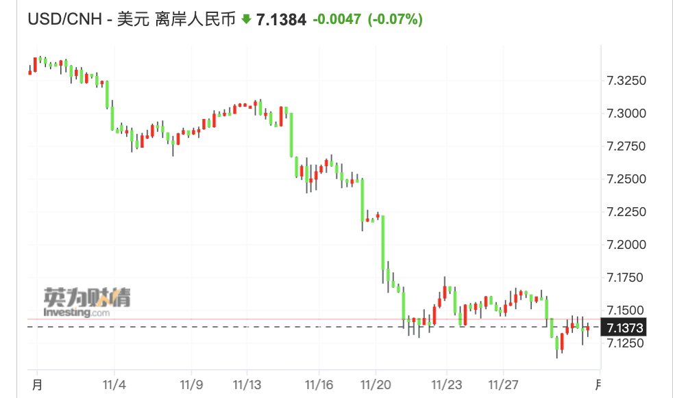 美元的走弱也推动人民币持续走强。尽管最新公布的中国11月PMI未达预期,但这丝毫未影响人民币的走势。