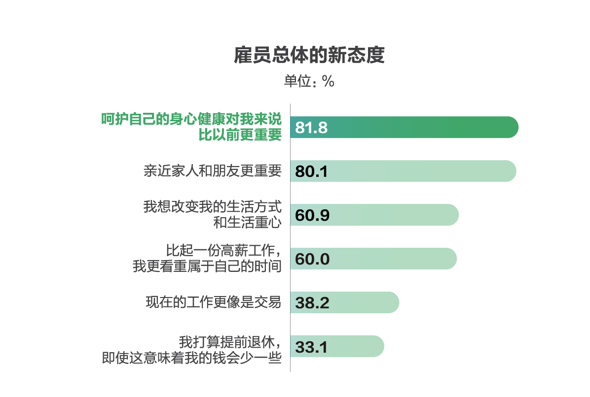 比如,越来越多的雇员开始重新调整自己人生的优先级,将呵护自己的身心健康放在更加重要的位置,在雇员中,这点的认同度高达81.8%,是所有新态度中认同度最高的一项。特别值得注意的是,刻板印象里可能此前疏于关注自己健康的一线和一般雇员,以及男性雇员,更重视呵护自己身心健康的比重,排名也很靠前。