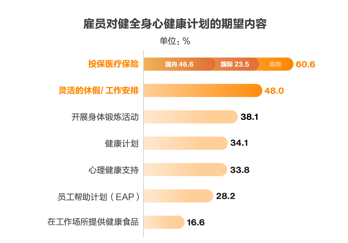对于健康计划的具体内容,投保国内医疗保险和灵活工作安排占据首位,比例分别高达60.6%、48%,其次是开展身体锻炼活动、健康计划和心理健康支持等。其中,男性、X世代和一般雇员更看重灵活的工作安排。