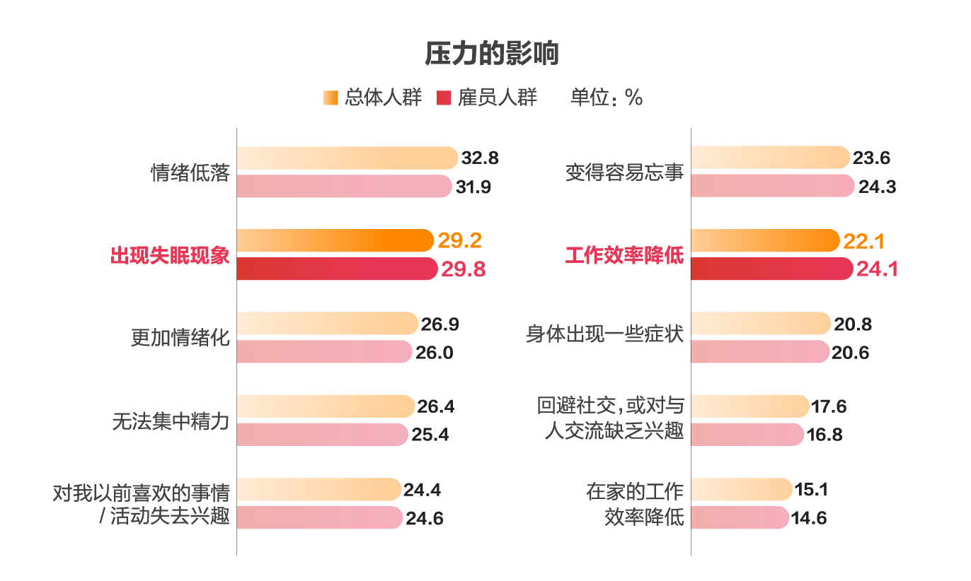 《白皮书》显示:与总人群的状况相比,雇员群体失眠和工作效率降低的情况相对更突出,职场整体的活力生态由此也受到影响。