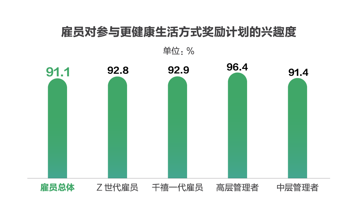 为了健康,他们也愿意为此付诸行动。高达91.1%的雇员有兴趣参加更健康生活方式奖励计划,尤其是职场当前主力千禧一代和下一届主力Z世代对此兴趣最为浓厚,比例分别高达92.9%和92.8%。而从职位上看,相较一般雇员及一线员工,中高层管理者对参与更健康生活方式奖励计划的态度也更为积极。