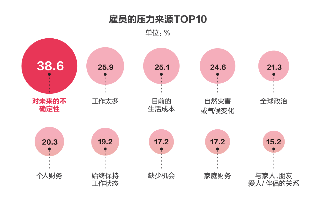 这其中,既有三年疫情带来的“后遗症”,使得近40%的受访雇员表示对未来的不确定性给自己带来了压力。诸如反反复复的疫情不断打乱人们既定的规划,个人乃至社会积极向上的发展势头可能也有所停滞,打击了人们对未来的信心,许多人不愿甚至不敢再对未来有所规划和设想。
