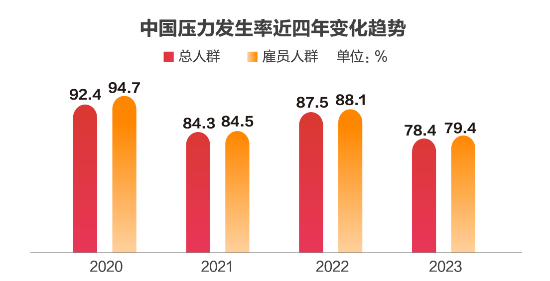 《白皮书》显示:2023年,中国总人群的压力发生率为78.4%,相比前一年下降了9.1个百分点,相比疫情初始的2020年更是下降了14个百分点。其中,雇员人群的压力发生率也显著下降,从2022年的88.1%降至2023年的79.4%,下降8.7个百分点。
