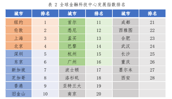 指数报告显示,2022年,在28个国内外重点城市中,纽约、伦敦、上海、北京、深圳的金融科技中心发展整体指数排名全球前五。