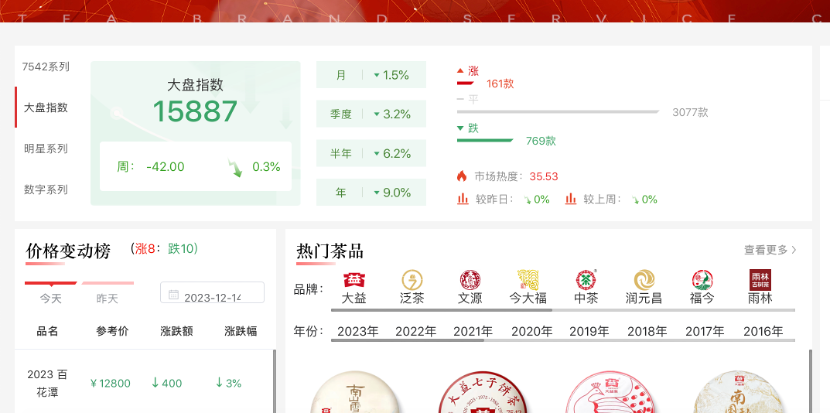 以某找茶平台为例,其首页中不仅清晰列明茶叶的大盘指数,还有细分板块的实时热度指数。而在具体茶品中,不仅会列明价格走势、参考报价、撮合买卖、涨跌排行榜,同时还可以购买“散片”(茶叶术语,每片重357克)。该平台自身也可提供鉴定、买卖服务,买卖范围覆盖多款热门茶品。