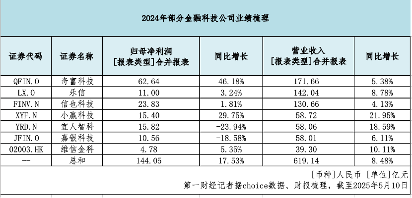 截至记者发稿,奇富科技(QFIN.O)、乐信(LX.O)、信也科技(FINV.N)、小赢科技(XYF.N)、宜人智科(YRD.N)、嘉银科技(JFIN.O)、维信金科(02003.HK)7家上市金融科技公司披露了2024年财报。