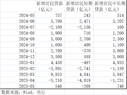 数据显示,5月住户贷款增加540亿元,同比少增217亿元,环比多增5756亿元。其中,居民短贷减少208亿元,同比少增451亿元,环比多增3811亿元。