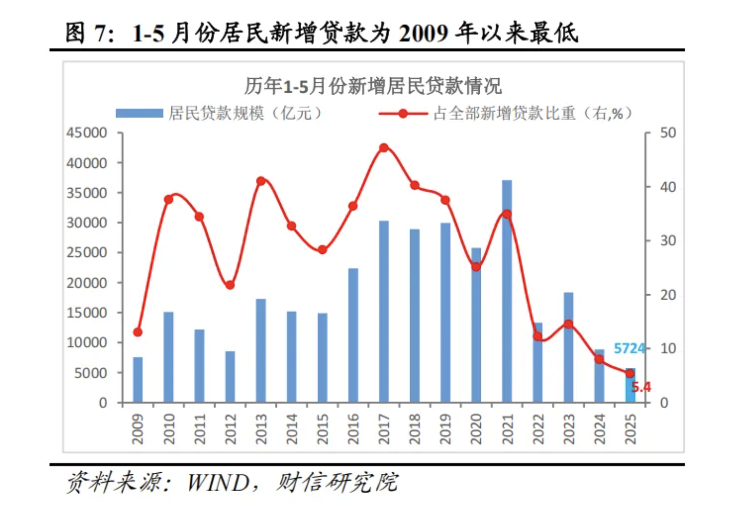财信研究院的统计数据显示,从累计数据看,1~5月,居民部门新增贷款不足6000亿元,占全部信贷的比重仅为5.4%,均为2009年以来最低水平,不足峰值期间的两成。