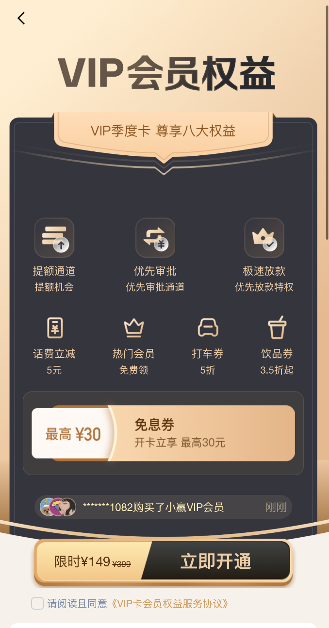 以小赢卡贷为例,记者在App上看到,该平台提供一款VIP季度卡服务,花费149元开通,可以获得提额通道、优先审批、极速放款三项权利,同时还可以获得话费立减、热门会员、打车券、饮品券等权益。