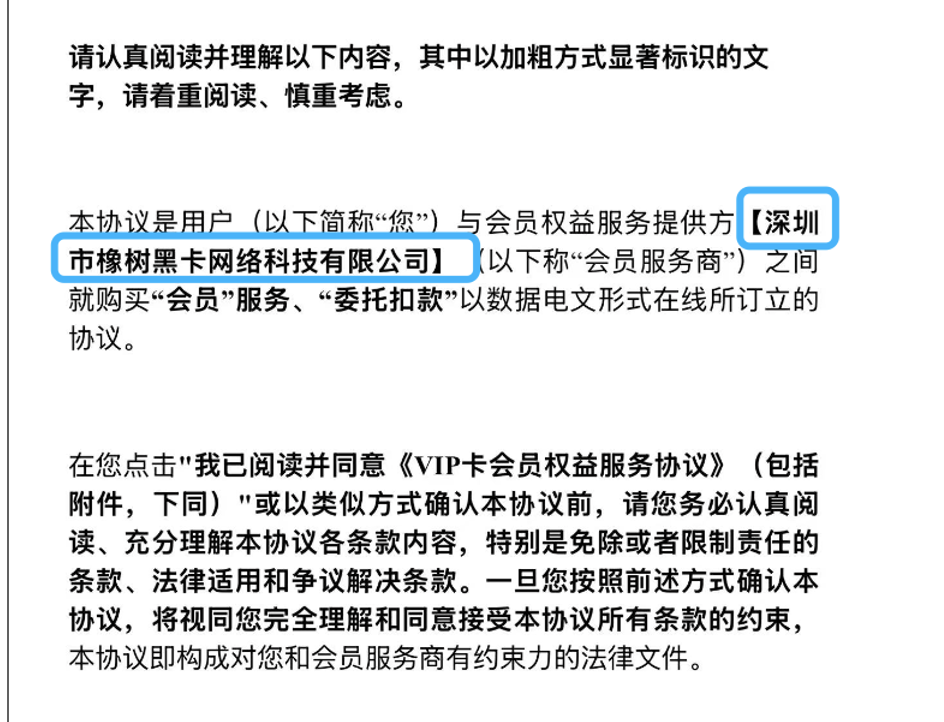 例如,在上述小赢卡贷的VIP会员权益合同中,记者注意到,合同提及会员权益服务提供方为深圳市橡树黑卡网络科技有限公司(下称“橡树黑卡”)。