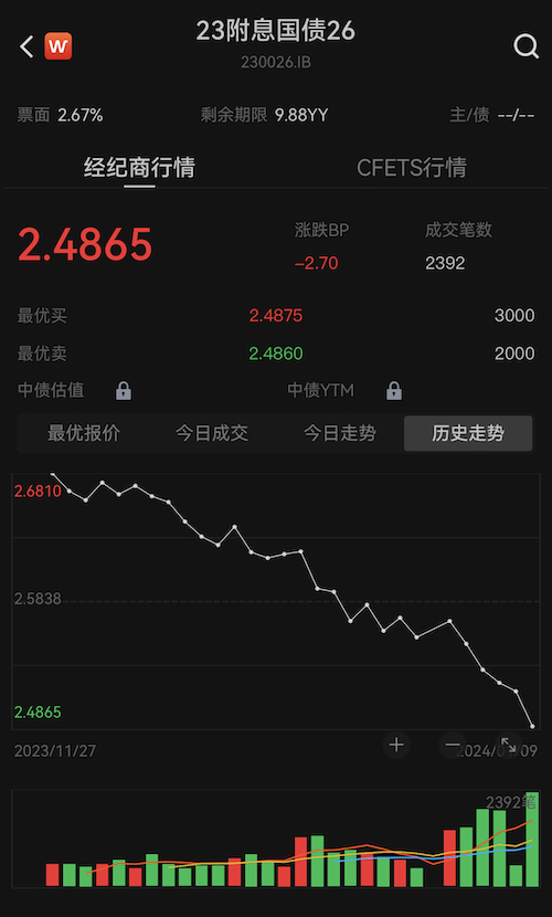 1月9日,银行间主要利率债收益率普遍下行,10年期国债活跃券“230026”收益率下破2.5%关口,收盘报2.486%,处于五年低位附近。