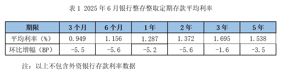 具体来看,在网点定期存款方面,报告数据显示,2025年6月,银行整存整取存款3个月期平均利率为0.949%,6个月期平均利率为1.156%,1年期平均利率为1.287%,2年期平均利率为1.372%,3年期平均利率为1.695%,5年期平均利率为1.538%。