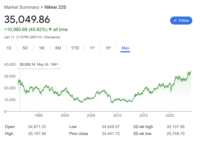 日本股市从去年开始就持续攀升,2023年全年涨幅接近30%。2024年1月11日,日经指数继续大幅攀升,收盘较前一交易日上涨608.14点,报35049.86点,自泡沫经济期的1990年2月以来,时隔约34年再度突破35000点大关,本月迄今累计涨幅为4.74%。