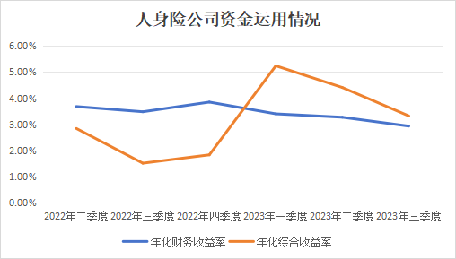 金融监管总局数据显示,近两年来人身险公司资金运用的年化财务收益率始终低于4%,且有逐季下降的态势。到了2023年三季度,年化财务收益率更是已经跌破了3%,至2.93%。而年化综合收益率则波动巨大,在2023年一季度冲高后迅速回落,三季度为3.32%。