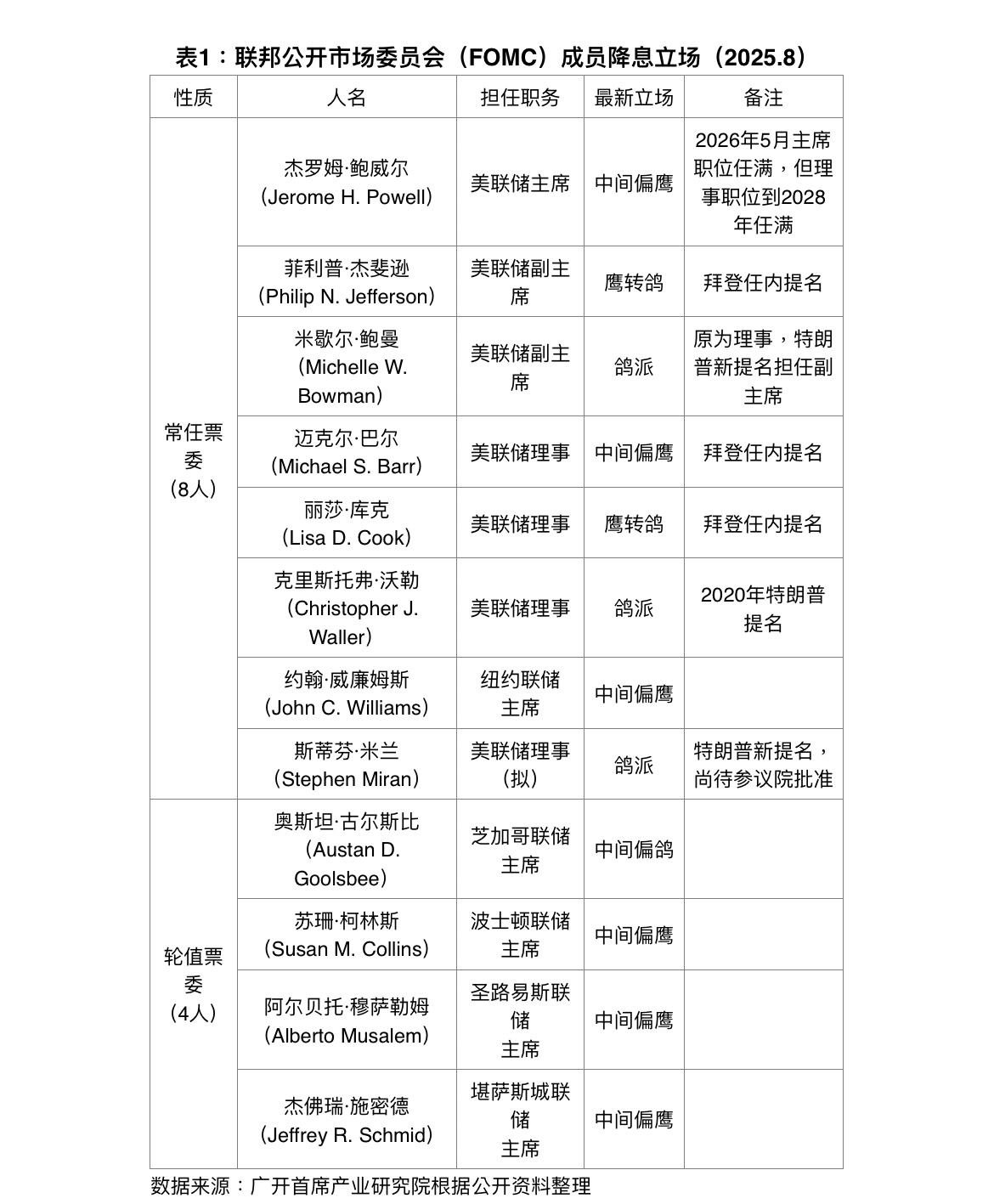 四是美联储内部鸽派力量增强。这其中既有特朗普直接插手的影响,如提名鲍曼取代巴尔担任美联储副主席,提名米兰接替辞职的库格勒出任美联储理事;也有部分官员根据经济形势变化自行调整了立场。其结果是,进一步改变了联邦公开市场委员会(FOMC)内部的力量平衡,使鸽派力量得到加强,推动美联储更快地实施宽松政策。