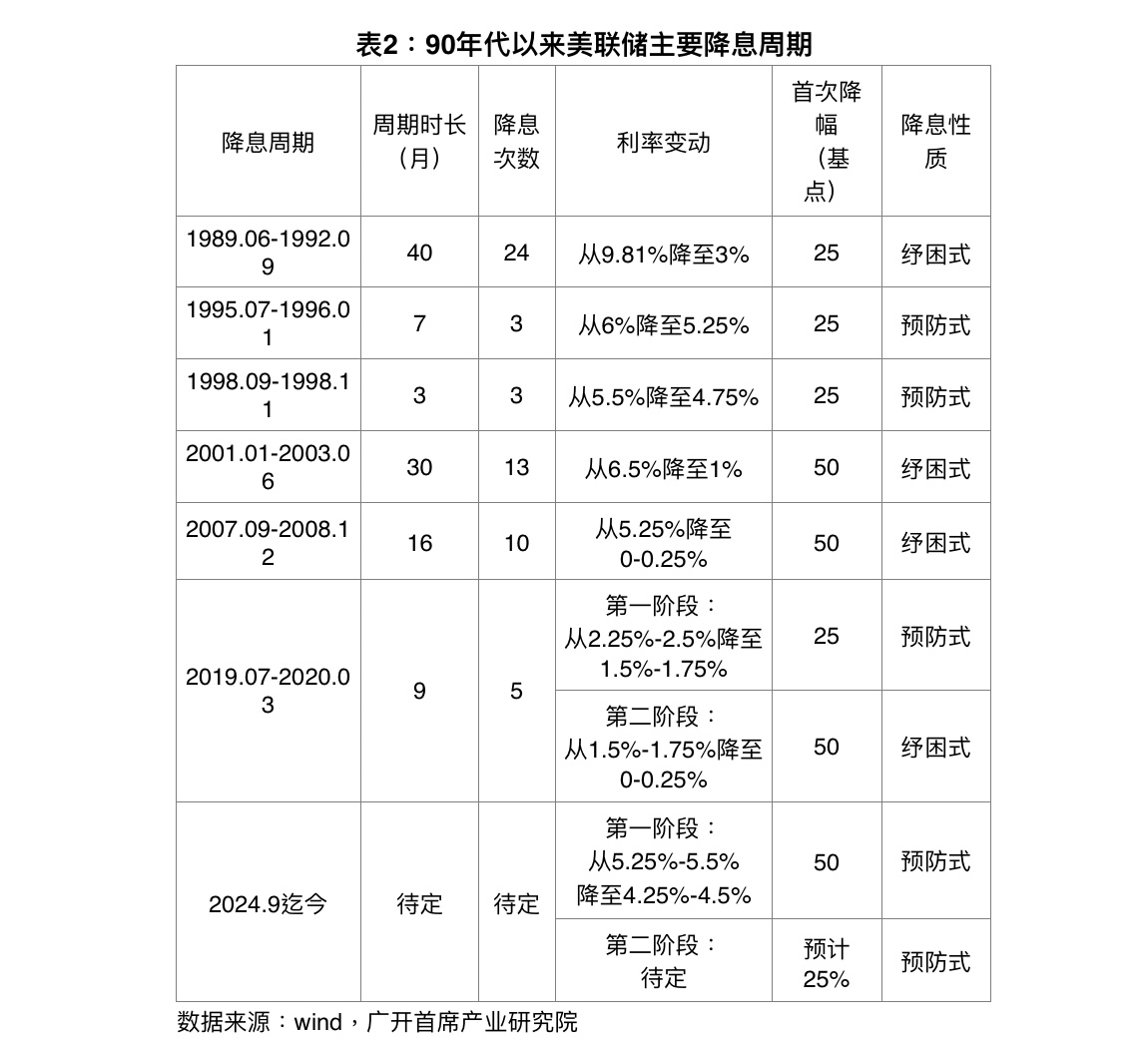 预防式降息通常指货币当局已察觉到经济正进入下行期,就业、物价、制造业和房地产等指标明显收缩,或面临潜在的外部传染威胁,但经济尚未正式进入衰退阶段或遭遇实质性冲击,遂决定实施前瞻性和预防性的逆周期政策,调整政策利率,以降低衰退出现的风险,推动经济“软着陆”。其特点是:降息周期相对较短;首次降息力度较为温和;降息次数总体有限;联邦基金利率未必降至2%以下。从1995-1996年、1998年美联储降息来看,持续时间只有3-7个月,降息次数不过3次,首次降息均为25个基点,累计降息幅度为75个基点左右,加之当时美国并未直接陷入明显的危机或衰退中,因而可以看作是比较典型的预防式降息。