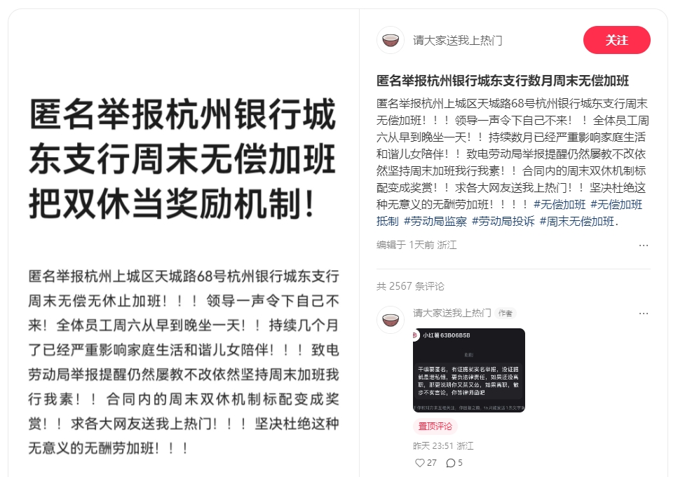 近日,一疑似杭州银行(600926.SH)员工在社交平台发帖,匿名举报杭州上城区天城路杭州银行城东支行存在周末无偿加班行为。发帖人称:“领导自己不来,全体员工周六从早到晚坐一天”。