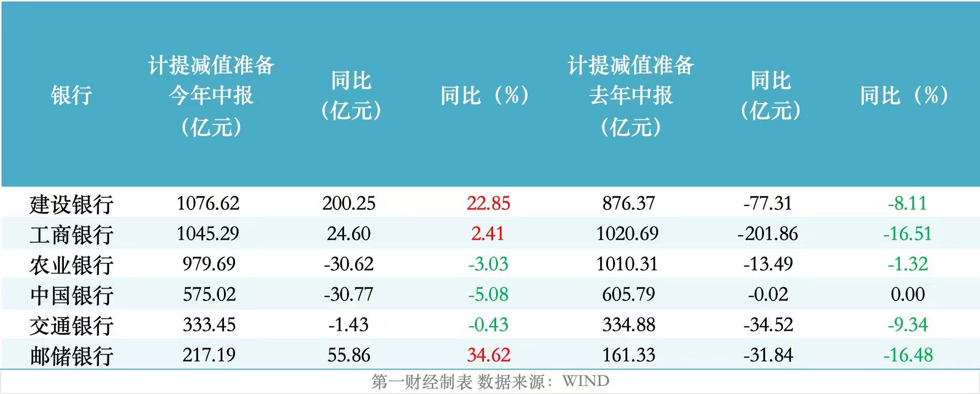 具体来看,今年上半年,建设银行、邮储银行、工商银行拨备计提力度不同程度加大,尤其邮储银行、建设银行计提减值准备规模同比大增34.62%、22.85%,对应增额约59亿元、200亿元。