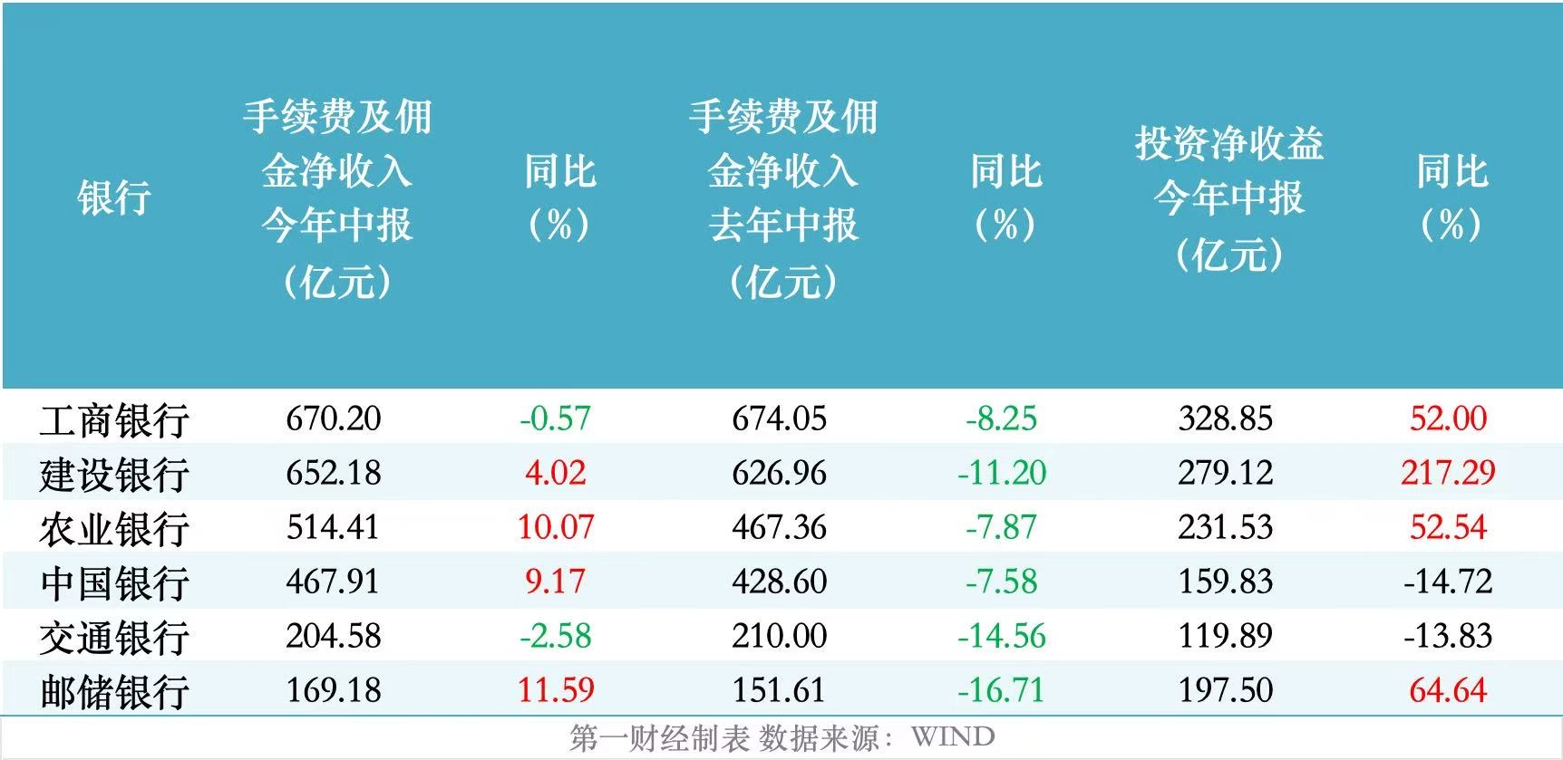 大行上半年另一个业绩支撑因素是手续费及佣金收入的回暖。数据显示,上半年有4家大行手续费及佣金净收入实现同比正增长,其中邮储银行、农业银行同比增幅超过10%,中国银行增幅也在9%以上。工商银行、交通银行手续费及佣金净收入降幅同比明显收窄。
