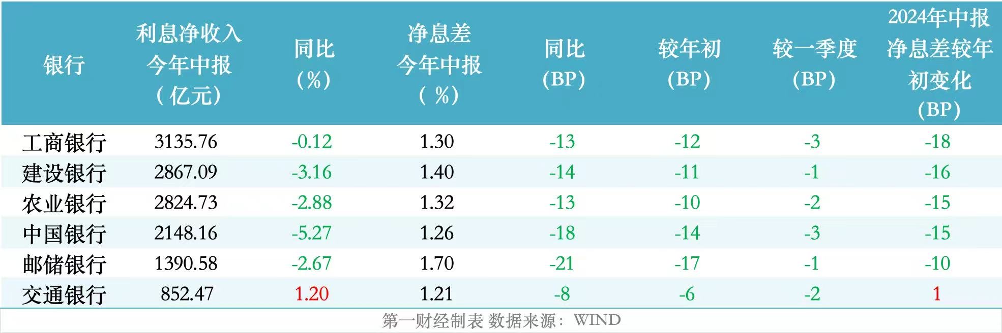 相比去年全年,上半年六大行中有5家净息差降幅超过10BP(基点),不过主要降幅发生在重定价密集的一季度,二季度各大行单季度净息差下行均不超过3BP。