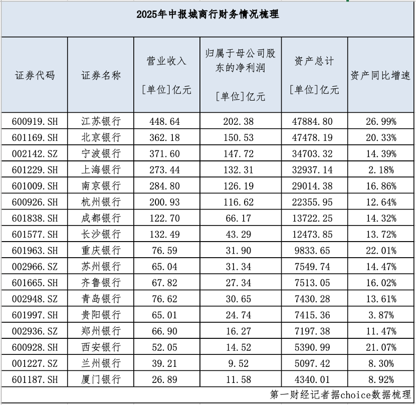 第三梯队则呈现出显著的内部分化:重庆银行和西安银行表现亮眼,资产总额分别为9833.65亿元和5390.99亿元,同比增速均超过21%;兰州银行、厦门银行等规模较小的银行增速不足9%。
