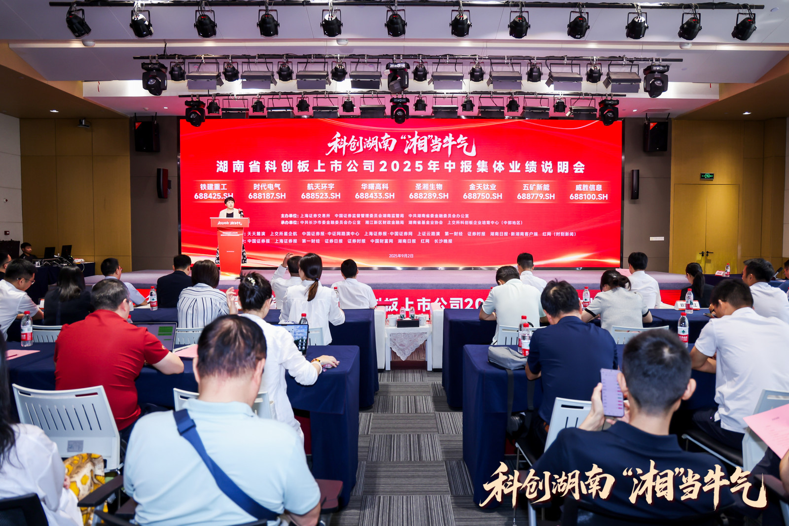 9月2日,湖南省科创板上市公司2025年中报集体业绩说明会在湖南湘江新区湘江基金小镇举行。本次业绩说明会由上海证券交易所、中国证券监督管理委员会湖南监管局、中共湖南省委金融委员会办公室主办,汇聚了铁建重工、时代电气、航天环宇、华曙高科、圣湘生物、金天钛业、五矿新能、威胜信息8家湖南科创板企业。
