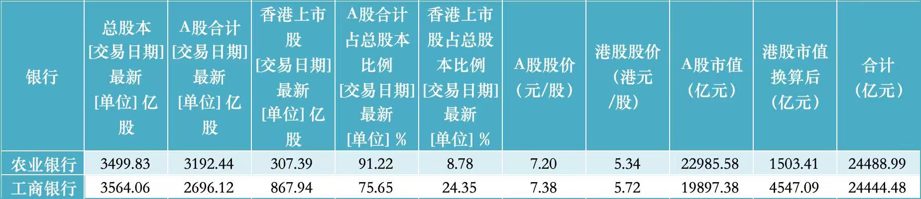 Wind最新数据显示,农业银行、工商银行总股本分别约为3500亿股、3564亿股。其中,A股股本占总股本比例分别在91%、76%左右,港股股本占比分别约为9%、24%。另从流通股占比来看,目前二者流通股占总股本比例均为100%。