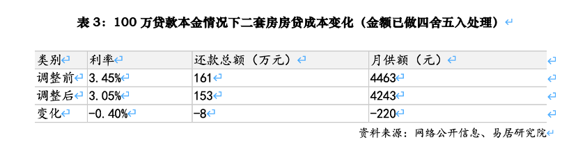 上海易居房地产研究院副院长严跃进表示,此前深圳首套房和二套房的利率定价公式分别为LPR-45BP和LPR-5BP。根据此次政策,二套房贷新发利率较之前降低40个基点。据此简单计算,按照100万贷款本金、30年期等额本息的方式计算,房贷总还款成本将减少近8万元、月供额将减少约220元。