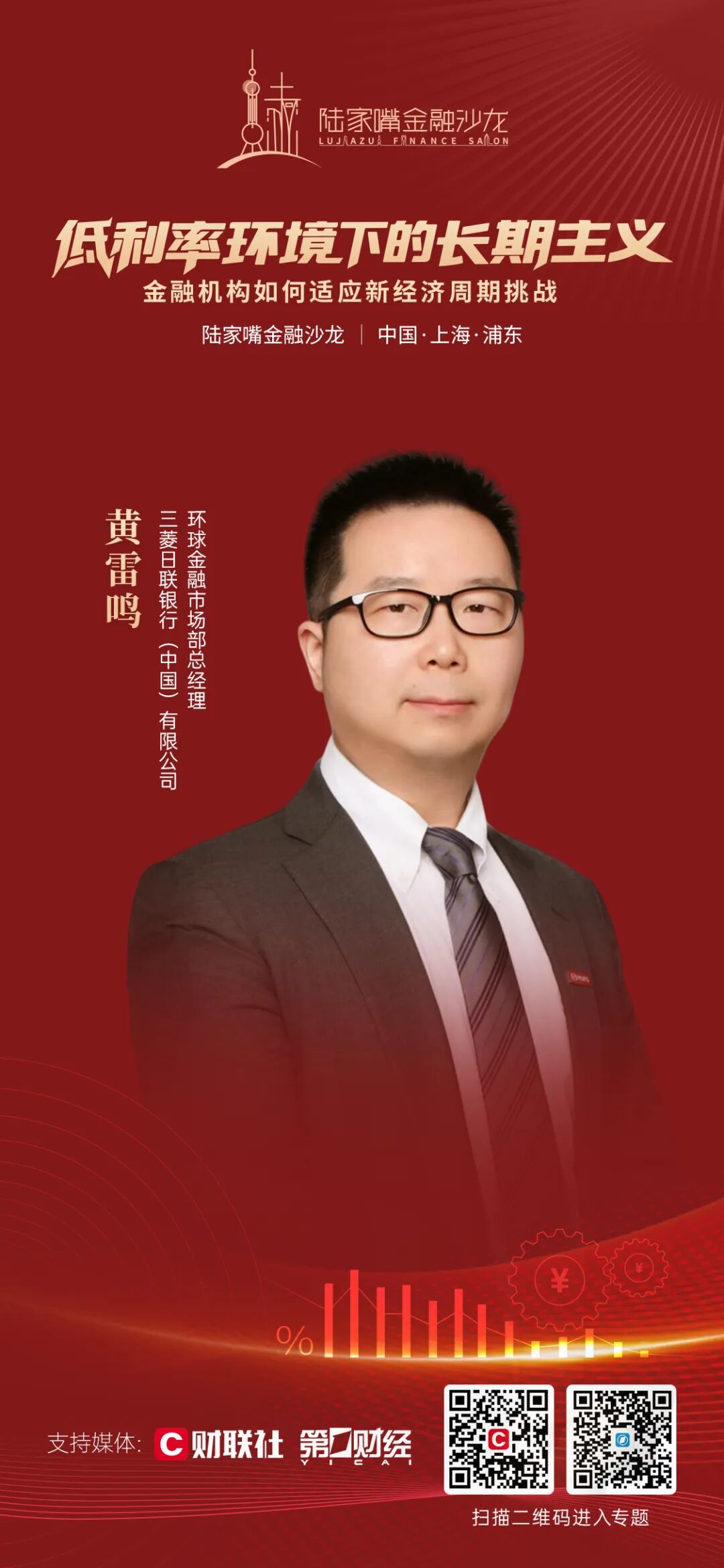 黄雷鸣,三菱日联银行(中国)有限公司环球金融市场部总经理,负责各类市场业务,包括资产负债及流动性管理,外汇、债券及相关衍生产品的交易与销售等。