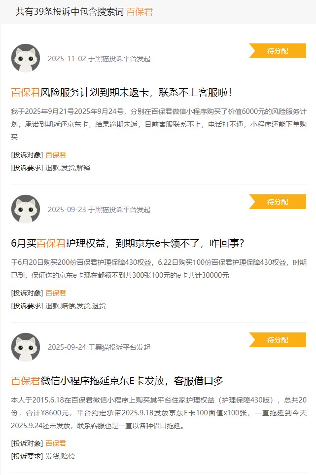 第一财经调查发现,今年10月以来,某平台上集中发布了24条针对百保君的投诉,均指向到期不能返还京东卡的问题。