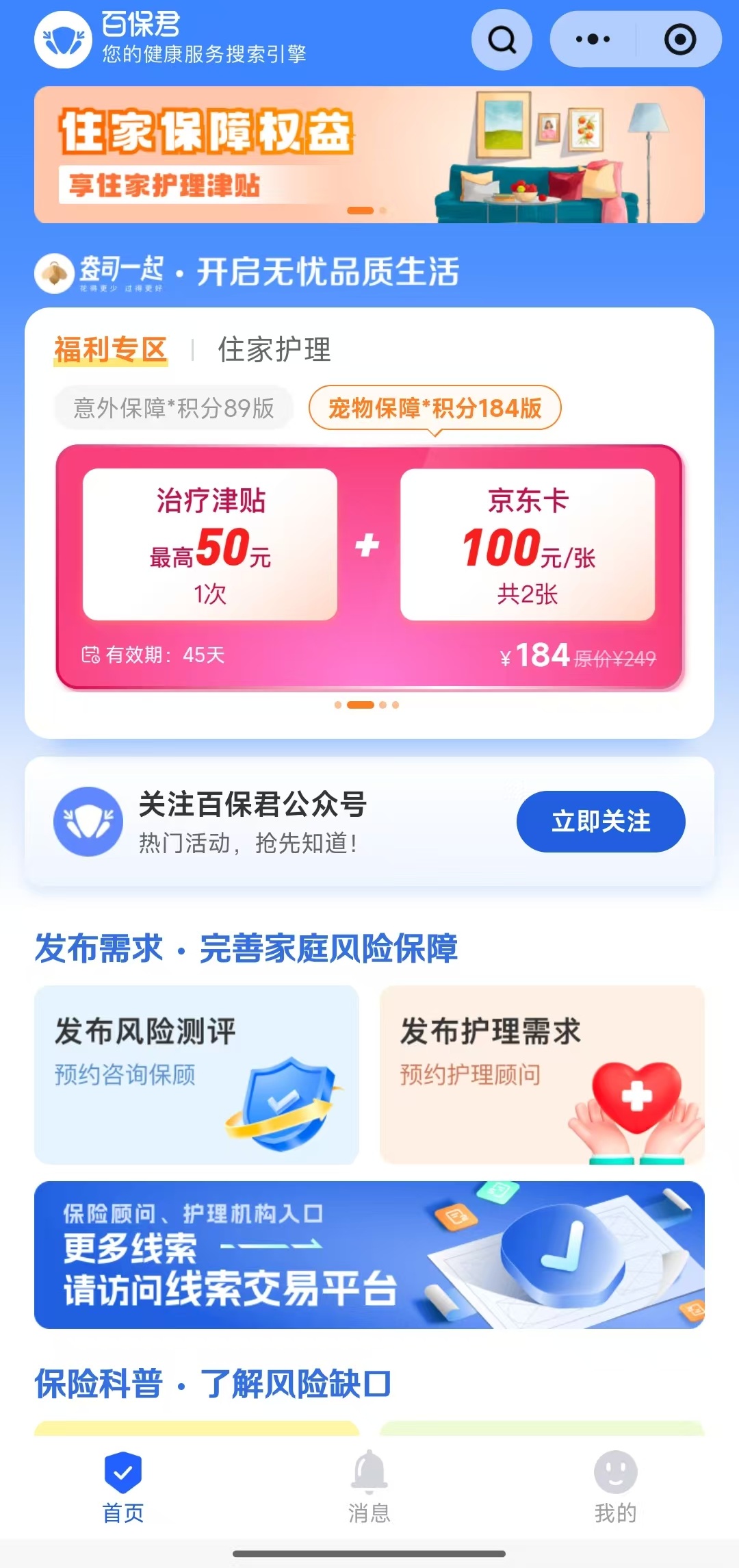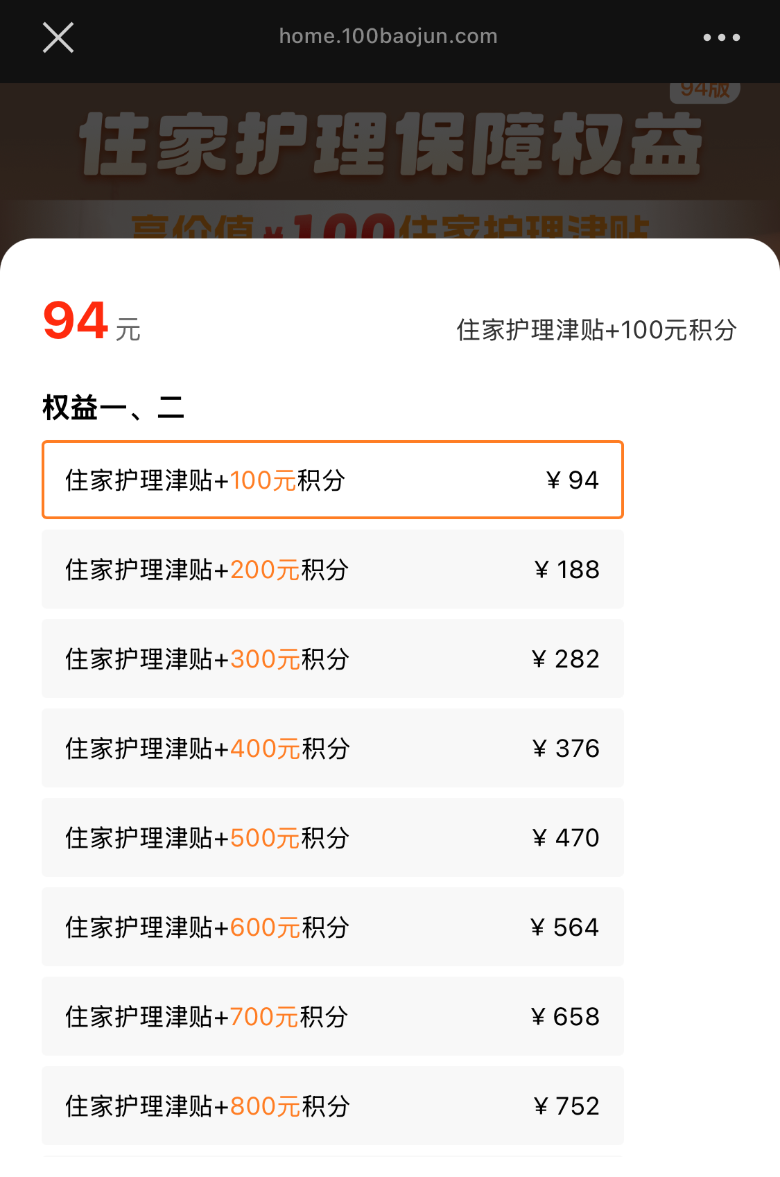 百保君的主页显示,一款名为住家护理保障权益(94)版的产品,保费最低94元,最高752元,可以享受住家护理津贴+不同数量的积分(购买日后60天~65天领取)。