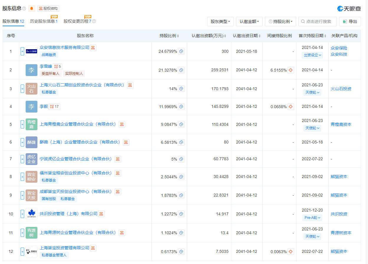 众安信息技术服务有限公司(即“众安科技”)为其第一大股东,持股比例为24.6799%,其次为李雪峰,持股比例为21.3278%。