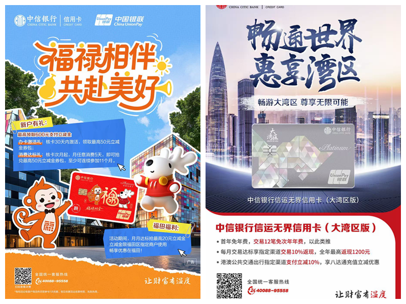 普惠金融板块聚焦民生消费需求,集中陈列两款特色信用卡产品:“中信银行颜 GO 卡福禄主题银联信用卡”针对新市民及福田区居民设计分层权益,新户核卡30天内激活可领最高50元立减金券包,核卡次月起月消费5天可抢兑最高50元立减金,福田区用户还可额外参与“月月达标抢20元福田商户立减金”活动;“中信银行信运无界信用卡(大湾区版)”则主打湾区跨境消费与出行,首年免年费、交易12笔免次年年费,每月交易达标享指定渠道10%返现(全年最高1200元),港澳公共交通支付立减10%、八达通充值优惠等权益,成为湾区居民跨境消费的优选。