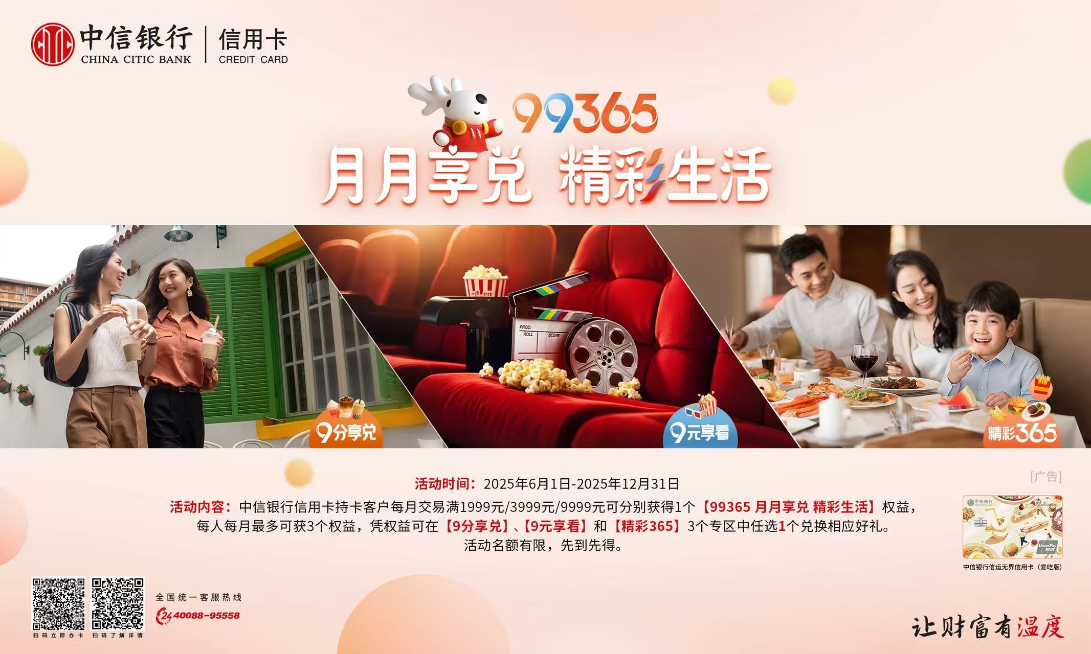 展会现场,中信银行信用卡中心通过直观展示与互动体验,让参观者近距离了解金融服务的创新亮点,其中“99365 月月享兑 精彩生活”活动尤其受关注——2025年6月1日至12月31日期间,指定持卡客户每月交易满1999元/3999元/9999元,可分别获得1个活动权益,所获权益可在“9分享兑”(咖啡奶茶/电商购物/爱车养车)、“9元享看”(电影购票/视听会员)、“精彩365”(餐饮美食/超市便利/加油充电等)三大活动专区兑换各类商户优惠,切实助力“扩内需、促消费”。
