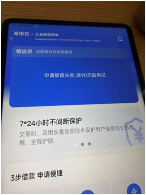 此外,部分月系融担APP不直接在APP商城上架,而是通过链接等隐蔽的形式开放给用户下载。上述“贷款超市”的月系单品频道中,记者点击一款名为“啄木花”平台的链接,点击后则导向“海银花”平台。用户必须完成多次注册,才能获取其APP的下载链接。在下载APP、注册、提交信息后,该平台要求授权通讯录信息,记者拒绝后,页面提示“申请额度已满,请90天后再试”。